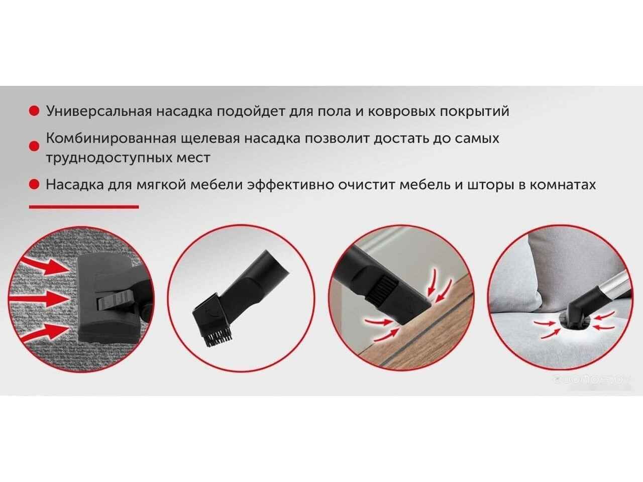 - Насадки в комплекте для ковра и пола, для мебели, щелевая