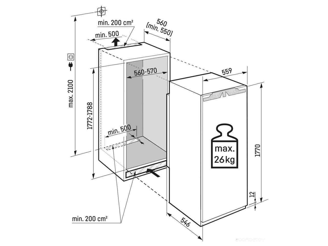 - Высота ниши для встраивания 177.2 см