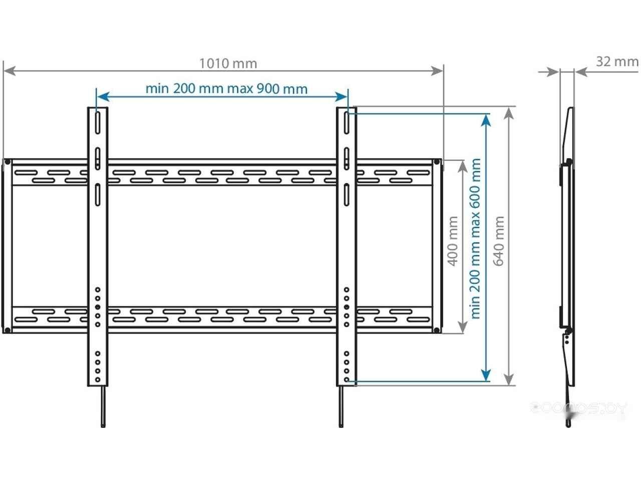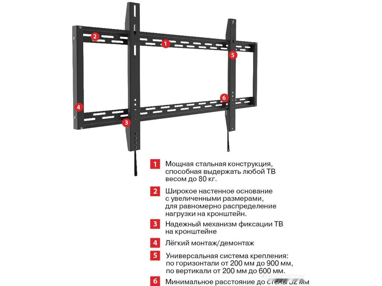 - Совместимость с креплением VESA 200x200, 200x300, 300x300, 300х200, 300х400, 400x200, 400x300, 400x400, 500x400, 600x400, 700x400, 700x500, 800x400, 800x500