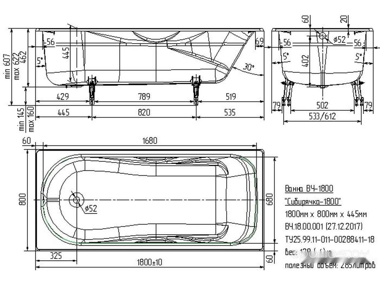 Ванна Универсал Сибирячка 180x80 (с ножками)